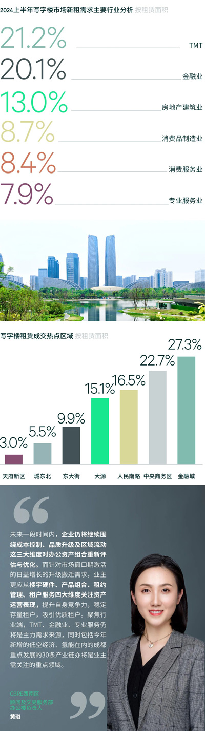 展望2024年下半年,成都優(yōu)質(zhì)寫字樓市場供應(yīng)回升,約65萬平方米的樓宇預(yù)計交付,將推動總存量在年末突破千萬;其中,62.4%的供應(yīng)將落于天府新區(qū),區(qū)域去化壓力將進一步加大。與此同時,順應(yīng)辦公需求靈活、多樣的趨勢,第三方辦公服務(wù)商預(yù)計保持擴張態(tài)勢;存量樓宇也將繼續(xù)積極應(yīng)變求進,通過改造空置房源以推出精裝、定制類產(chǎn)品。因此,下半年供應(yīng)端不僅量升,亦將呈現(xiàn)更多元化的辦公產(chǎn)品,市場競爭或?qū)⒓觿 ?/P>
