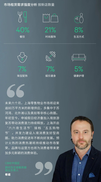 零售業(yè)態(tài)新租占比有所提升,其中服飾類需求占比21%,以戶外運(yùn)動類品牌的活躍布局為引領(lǐng),潮流女裝品牌與潮流設(shè)計師品牌線下布點(diǎn)亦較為活躍,中國首家WTAPS落址上海新天地,芮歐百貨迎來KKRIZIA、American Vintage及ANINE BING等一系列品牌首店進(jìn)駐。此外,生活方式以及珠寶配飾品類需求亦較為顯著,分別占比8%和7%,配飾市集品牌amywrong阿米望全國首店在環(huán)球港開業(yè)。