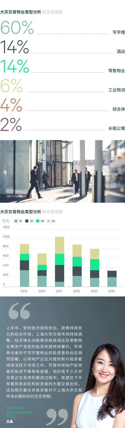 2024年上半年,上海物業(yè)投資市場(chǎng)錄得50筆交易,交易金額共計(jì)323.3億元,較去年同期水平微降6.6%。市場(chǎng)情緒仍在緩慢修復(fù),資產(chǎn)價(jià)格步入磨底階段,物業(yè)投資表現(xiàn)逐步分化,核心資產(chǎn)投資吸引力愈發(fā)凸顯,上半年錄得約12%的交易位于陸家嘴、南京西路等傳統(tǒng)核心商務(wù)區(qū)。