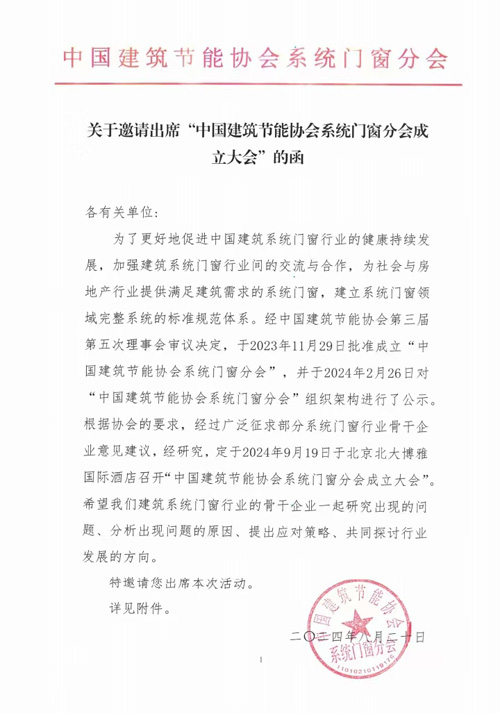 關于邀請出席“中國建筑節(jié)能協(xié)會系統(tǒng)門窗分會成立大會”的函