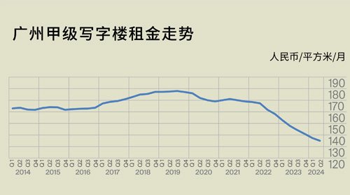 第二季度,廣州市的寫字樓租賃市場繼續(xù)呈現(xiàn)出下行趨勢,租金水平滑落至每月每平方米135.0元,較上月環(huán)比下挫1.7個(gè)百分點(diǎn)。