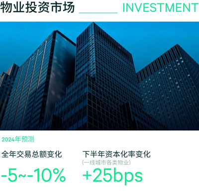 展望2024全年,考慮到租賃市場的弱勢,以及投資者對行進(jìn)中的資產(chǎn)重估仍保持謹(jǐn)慎,大宗投資交易額預(yù)計(jì)同比下降5-10%。預(yù)計(jì)下半年一線城市各類物業(yè)的資本化率繼續(xù)上行,投資者尋求更高的租賃風(fēng)險(xiǎn)溢價(jià)以增強(qiáng)投資“安全墊”?怪芷谛愿鼜(qiáng)的長租公寓以及周期性回升的零售物業(yè)、酒店等是短期內(nèi)投資者重點(diǎn)關(guān)注的資產(chǎn)類型。同時(shí),伴隨著資產(chǎn)價(jià)格的重置進(jìn)程和市場預(yù)期不斷趨近于一致,核心型物流資產(chǎn)包和辦公樓交易機(jī)會也將逐漸增多。此外,工商業(yè)用地使用權(quán)延期和到期續(xù)期被納入未來五年的改革目標(biāo),有望在中長期提振投資者對中國商業(yè)地產(chǎn)的信心。