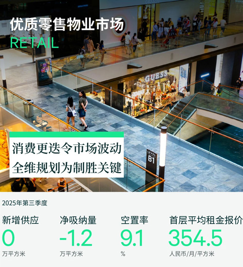 然而,消費場景、結構的更迭從另一方面也導致傳統(tǒng)零售主力店的持續(xù)退租,如健身房、電影院及書店等;同時服飾品牌亦繼續(xù)整合店鋪,因此三季度零售物業(yè)市場凈吸納量連續(xù)第三個季度錄得負值,負約1.2萬平方米。市場整體空置率環(huán)比上升0.1個百分點至9.1%,購物中心首層平均租金報價維持下行趨勢,環(huán)比下跌0.7%至354.5元每平方米每月。