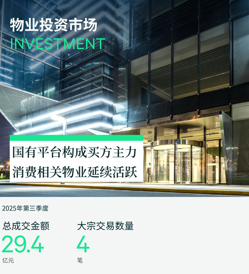 2025年第三季度,成都物業(yè)投資市場錄得4筆交易,合計交易金額約29.4億元,環(huán)比上漲33.2%。標的物來看,包括辦公樓、奧特萊斯和綜合體;買家均為投資型,包括國有平臺、地產基金和房企,其中季內房地產基金是國內首只QFLP不動產試點基金及首只奧特萊斯并購基金,在基金類型與資產業(yè)態(tài)上實現了雙重創(chuàng)新。