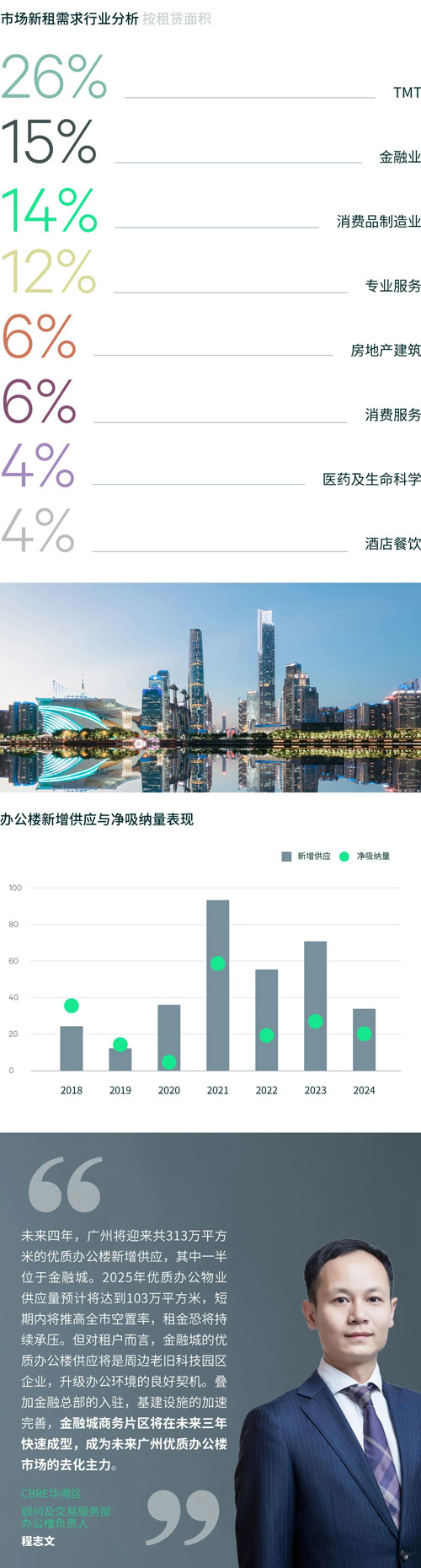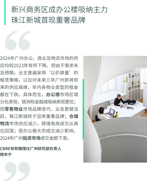 TMT成交中,46%的成交面積來自軟件系統(tǒng)開發(fā),包括互聯(lián)網(wǎng)+和AI對(duì)于營銷和制造業(yè)等方面的支持應(yīng)用,并且超過76%的搬遷案例擴(kuò)張了面積,或者搬遷到了更好的辦公樓。游戲行業(yè)成交保持活躍,成交占比小幅攀升,其中琶洲錄得某手游開發(fā)公司區(qū)內(nèi)搬遷擴(kuò)租成交,共6,900平方米。金融業(yè)成交面積中,其他金融服務(wù)占比36%,如小額貸款、不良資產(chǎn)管理和財(cái)富管理等;除此以外,保險(xiǎn)業(yè)排名第二位,占金融行業(yè)成交面積28%。表現(xiàn)活躍的還有快消品行業(yè),盡管錄得的成交面積僅較2023年小幅增長,但成交宗數(shù)顯著增加,是往年的2.6倍,其中超過五成的交易案例位于琶洲,如某本地化妝品總部從園區(qū)升級(jí)到優(yōu)質(zhì)辦公樓7,500平方米。