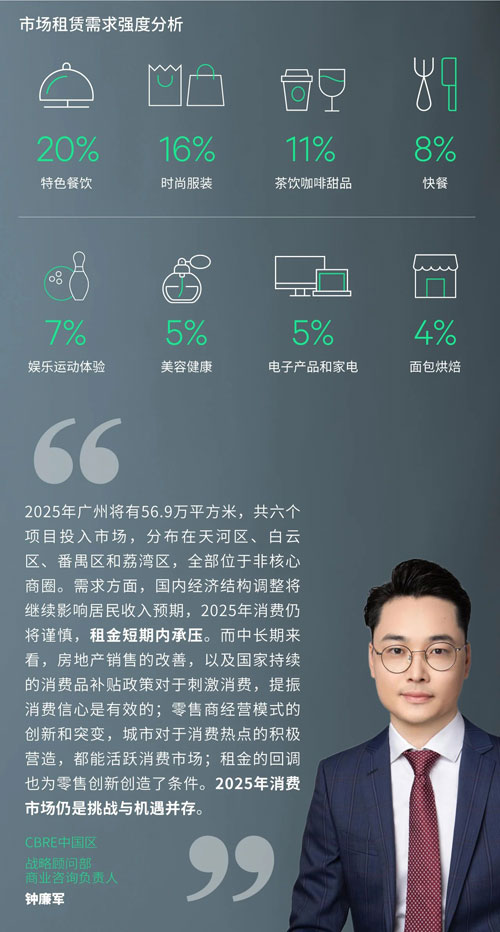 細(xì)分業(yè)態(tài)方面,餐飲業(yè)態(tài)中表現(xiàn)最活躍的是特色餐飲,43%的新店來自該類別,包括落址于天環(huán)的廣州首家肉肉大米,而年底開業(yè)的廣州塔廣場(chǎng)也引入多家餐飲的廣州首店。另外,面包烘焙在餐飲新店中占比9.2%,較2023年顯著提升4.1個(gè)百分點(diǎn),是餐飲業(yè)態(tài)中增長最快的類別。KUMO KUMO年內(nèi)在廣州快速擴(kuò)張,而好利來也在廣州塔廣場(chǎng)圍板其廣州首店。零售方面,時(shí)尚服裝、電子產(chǎn)品和家電、以及珠寶配飾新店數(shù)量占比排名前三。其中最值得關(guān)注的是,珠江新城K11年內(nèi)陸續(xù)圍板奢侈品牌,如GUCCI和Dolce & Gabbana等,珠江新城商圈定位和形象都將被帶動(dòng)提升。而天河路商圈中,表現(xiàn)最突出的是成交顯著提升的運(yùn)動(dòng)品牌,錄得的新店達(dá)到商圈零售新店數(shù)量的18.5%,較2023年增加了15.7個(gè)百分點(diǎn)。