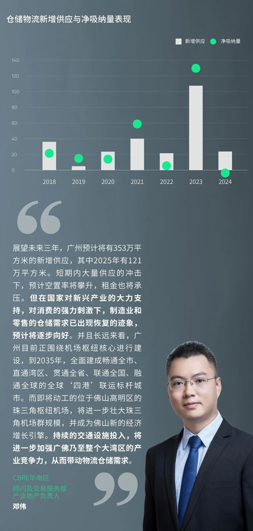 縱觀全年,跨境電商對(duì)廣州高標(biāo)倉的新增需求已從高峰回落,盡管上半年仍能錄得跨境巨頭在黃埔和增城的成交,但下半年未見繼續(xù)擴(kuò)張,整體成交面積遠(yuǎn)低于2023年的峰值水平。為此,業(yè)主積極調(diào)整租賃策略,全年租金同比下跌1.3%至年末的每月每平方米38.5元。其中增城和從化的租金調(diào)整幅度較大,分別同比下調(diào)6.8%和5.3%。租金調(diào)整吸引了租戶的搬遷,下半年錄得某零售商從非高標(biāo)庫搬遷升級(jí)至從化高標(biāo)庫。服務(wù)于某快消品牌工廠的第三方物流也從黃埔搬遷至從化新租高標(biāo)庫。除此以外,根據(jù)廣州市統(tǒng)計(jì)局發(fā)布的數(shù)據(jù),在以舊換新及家電國補(bǔ)政策帶動(dòng)下,廣州1-11月限額以上家用電器和音像器材實(shí)現(xiàn)零售額同比增長4.2%,增速比前十個(gè)月上升了4個(gè)百分點(diǎn),帶動(dòng)了國內(nèi)電商季節(jié)性倉儲(chǔ)需求,如某電商在增城新租了高標(biāo)庫等。