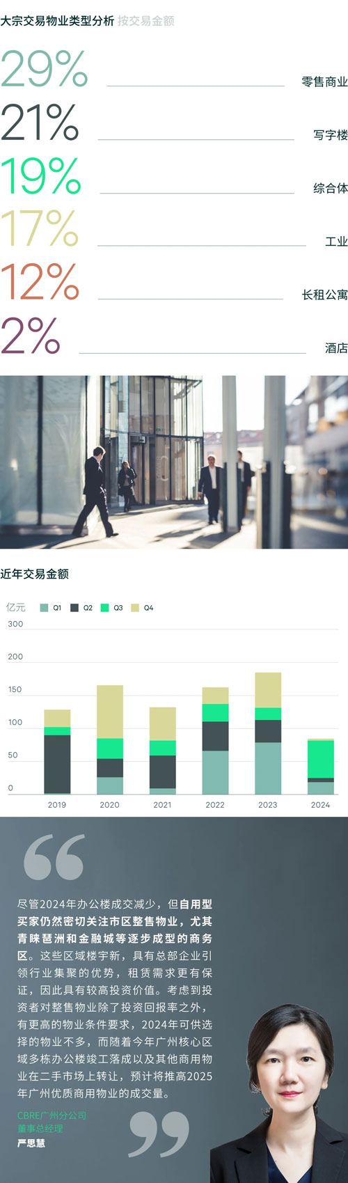 廣州2024年大宗物業(yè)投資成交顯著減少。全年共錄得21宗交易,總成交金額84.6億元人民幣,同比減少54.4%,但成交宗數(shù)僅同比減少16.0%,少四宗,顯示平均每宗成交的成交金額有所下降。廣州商辦物業(yè)租賃市場(chǎng)仍處于復(fù)蘇階段,且優(yōu)質(zhì)物業(yè)的價(jià)格或物業(yè)條件未達(dá)投資者預(yù)期,這些都影響了投資者的投資意愿。