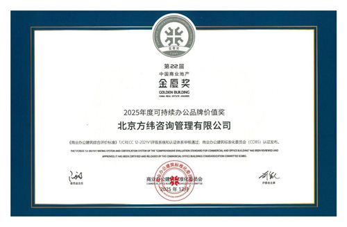 2025年12月,方緯咨詢憑借在可持續(xù)辦公領域的卓越實踐與品牌影響力,榮膺商業(yè)地產(chǎn)權威獎項“金廈獎”2025年度可持續(xù)辦公品牌價值獎。我司總經(jīng)理李秀明先生作為代表出席頒獎晚宴。此次獲獎不僅是對方緯咨詢過往成果的肯定,更是推動行業(yè)綠色轉型的新起點。