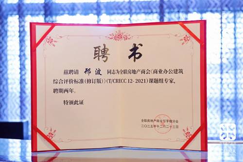 邢波被聘全聯(lián)房地產(chǎn)商會(huì)《商業(yè)辦公建筑綜合評(píng)價(jià)標(biāo)準(zhǔn)(修訂版)》(T/CRECC12-2021)課題組專家,特頒發(fā)榮譽(yù)證書(shū)。