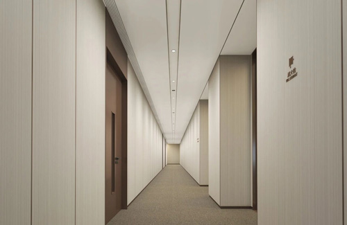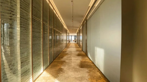 匠心品質(zhì),也延伸至維晟中心觸手可及的每一處。首層大堂以10米挑高,構(gòu)筑出一座 “光之殿堂”。墻面由上萬塊定制琉璃玻璃磚立體疊砌,在兩側(cè)燈光映照下,呈現(xiàn)出空靈而夢幻的光影效果。天花采用簡潔的磨砂鏡面與格柵設(shè)計,巧妙隱藏末端設(shè)備,將視覺焦點留給璀璨的墻面。