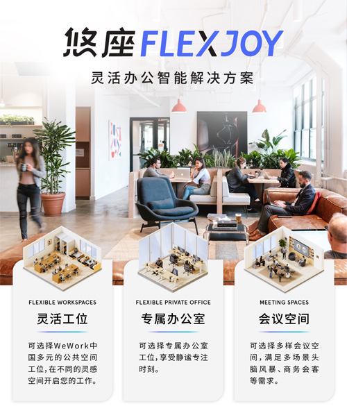 今年6月,我們?nèi)蚴装l(fā)的靈活辦公智能解決方案—— 「悠座FLEXJOY」,將辦公空間的使用權(quán)分解至 “小時級” 顆粒度,以“時間零售”的形式售賣辦公空間,構(gòu)建全流程數(shù)字化辦公體驗(yàn)。