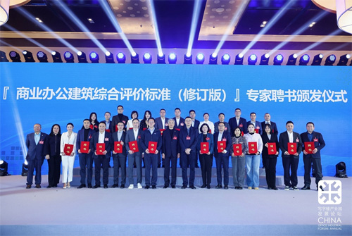 論壇期間,全聯(lián)房地產(chǎn)商會寫字樓分會、商業(yè)辦公標(biāo)準(zhǔn)化委員會隆重舉行了《商業(yè)辦公建筑綜合評價標(biāo)準(zhǔn)(修訂版)》課題組首批專家聘書頒發(fā)儀式。
