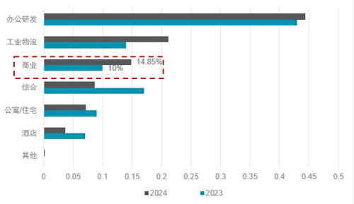 中國(guó)的零售市場(chǎng)也正在經(jīng)歷消費(fèi)重構(gòu)及運(yùn)營(yíng)的大資管時(shí)代,追求品質(zhì)、社交、個(gè)性、體驗(yàn)的消費(fèi)需求正成為主流,這些需求倒逼消費(fèi)場(chǎng)景不斷迭代升級(jí)。隨著基礎(chǔ)設(shè)施公募REITs擴(kuò)容至消費(fèi)基礎(chǔ)設(shè)施,零售物業(yè)投融管退閉環(huán)的形成也極大激發(fā)了投資者的投資意愿。戴德梁行的數(shù)據(jù)顯示,2024年,商業(yè)類項(xiàng)目的投資成交額占比由2023年的10%上升至14.85%(圖一),2025年趨勢(shì)仍將延續(xù)。