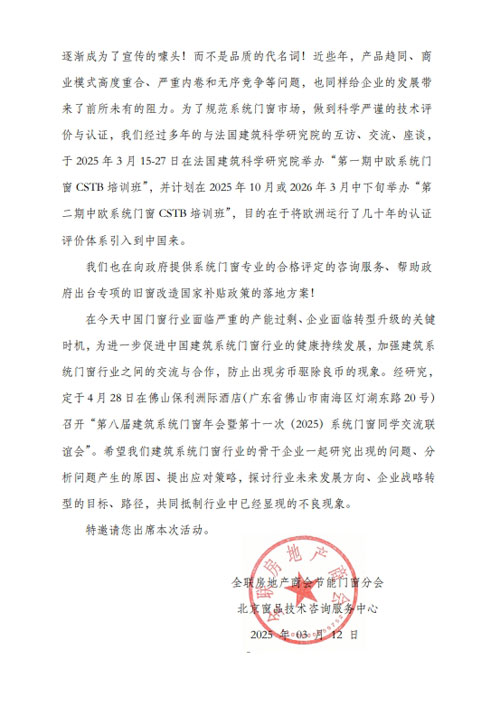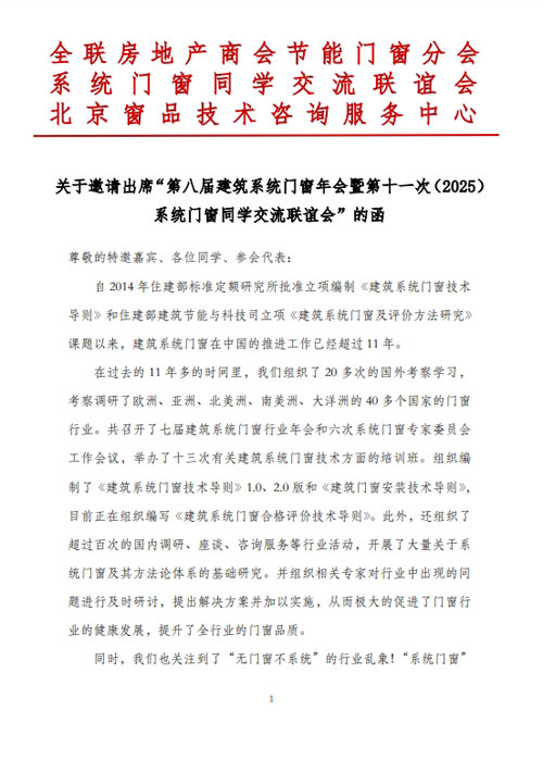 關(guān)于邀請(qǐng)出席“第八屆建筑系統(tǒng)門窗年會(huì)暨第十一次(2025)系統(tǒng)門窗同學(xué)交流聯(lián)誼會(huì)”的函