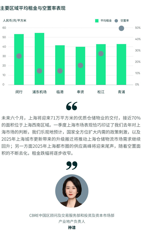 空置率維持在高位29%,業(yè)主降價去化意愿強烈,租金繼續(xù)下跌,環(huán)比下跌4%至每月每平方米42.0元。金山和青浦依然面臨較大的去化壓力,租金在尋底;閔行環(huán)比跌幅擴大;臨港則相對穩(wěn)健。