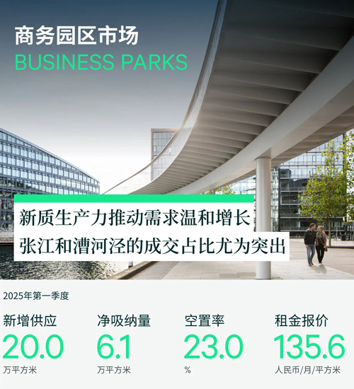 2025年第一季度,上海產(chǎn)業(yè)園區(qū)市場新增兩個供應,分別是浦江板塊的東方智媒城一期和漕河涇的鑫耀中心,新增面積合計199,527平方米,環(huán)比和同比均有所回落。受新增供應和租戶變動的影響,季末整體空置率環(huán)比上升0.7個百分點至23%。