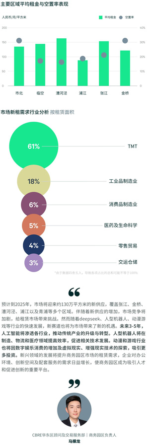 對比各子市場表現(xiàn),張江板塊與漕河涇的租賃需求保持活躍態(tài)勢,分別占比45%和40%。張江的主要需求來源于TMT、工業(yè)品制造業(yè)(半導體)和生物醫(yī)藥類租戶,而漕河涇板塊則持續(xù)吸引TMT和消費品制造業(yè)等領域的企業(yè)入駐。 總體來看,租賃需求呈現(xiàn)出溫和增長的趨勢,但仍處于不平衡狀態(tài)。考慮到今年的供應高峰,業(yè)主不得不采取更積極的租金政策以吸引租戶。因此,季末全市平均租金報價環(huán)比下降0.9%,降至每月每平方米135.6元。