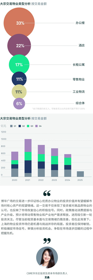 2025年第一季度,上海物業(yè)投資市場共錄得18筆交易,交易總額約151.7億元,環(huán)比上漲36.3%。盡管市場交易金額有所上升,但整體觀望氛圍仍然濃厚。值得一提的是,博華廣場交易作為近三年來唯一的超百億級單體項目成交,有望為市場注入積極信號。