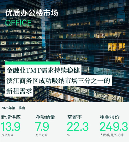 2025年第一季度,上海辦公樓市場共錄得兩個新項目交付,分別是靜安區(qū)的靜投中心以及徐匯區(qū)的徐匯萬科中心三期(T2),共計體量13.9萬平方米。淡季不淡,盡管受到假期因素的影響,一季度的數(shù)據(jù)表現(xiàn)卻顯示出回暖的潛在趨勢。全市凈吸納量環(huán)比和同環(huán)比均有提升,達到了7.9萬平方米,整體空置率環(huán)比微升0.2個百分點,達到22.3%。