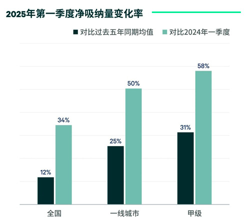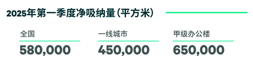 2025年第一季度,全國十大主要城市的辦公樓凈吸納量同比增長34%,高于過去五年同期均值12%,辦公樓市場初現(xiàn)復(fù)蘇跡象。