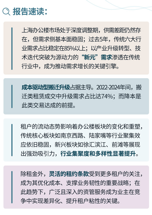 上海是中國經(jīng)濟發(fā)展的前沿地帶,其辦公樓市場的發(fā)展脈絡(luò)和格局變化與宏觀經(jīng)濟潮汐共振。仲量聯(lián)行最新發(fā)布的《2025上海辦公樓市場白皮書》以2022-2024年近1,200條租約數(shù)據(jù)為基礎(chǔ),甄別了近期市場需求的流動趨勢和辦公樓板塊的潛力機遇;并結(jié)合近百份租戶調(diào)研結(jié)果,描繪當下選址策略全景圖,以期為行業(yè)各方指引航向,蓄勢而行。