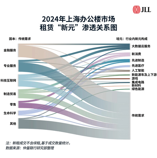 與此同時,伴隨科技迭新、產(chǎn)業(yè)升級、消費轉(zhuǎn)向,傳統(tǒng)行業(yè)中涌現(xiàn)出了引領(lǐng)需求增長的新興元素:如云計算已承載傳統(tǒng)金融的核心業(yè)務(wù)、AI技術(shù)賦能量化基金、情緒價值的重視和消費偏好的轉(zhuǎn)變豐富了新消費領(lǐng)域的辦公需求。在仲量聯(lián)行統(tǒng)計的2024年超450條租賃交易中,具備“新元”概念的企業(yè)租賃需求占比達到30%;此外,在仲量聯(lián)行整理的2018-2024年獲得C輪及以后股權(quán)融資的上海企業(yè)中,“新元”類別公司占比由40%攀升至約80%。