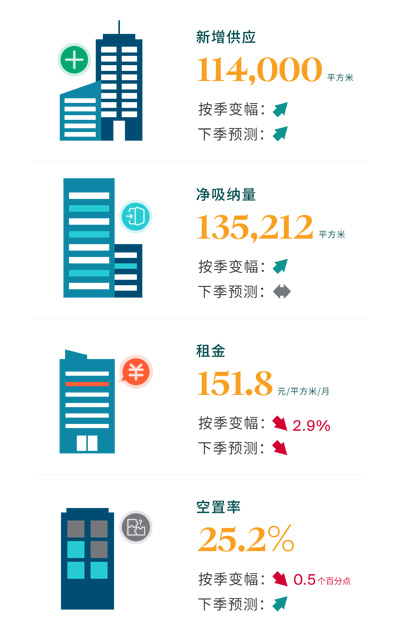 第二季度,深圳甲級(jí)寫字樓租賃市場(chǎng)需求如期有序修復(fù)。平安信用卡大廈作為本季度唯一新增供應(yīng)項(xiàng)目,入市體量達(dá)11.4萬(wàn)平方米,供應(yīng)端保持結(jié)構(gòu)性釋放。與此同時(shí),企業(yè)辦公需求顯著回暖,推動(dòng)全市凈吸納量顯著回升至13.5萬(wàn)平方米,錄得可觀的環(huán)比及同比增幅。得益于凈吸納量的有力支撐,新增供應(yīng)得以有效消化,全市空置率環(huán)比下降0.5個(gè)百分點(diǎn)至25.2%,釋放出階段性企穩(wěn)的積極信號(hào)。