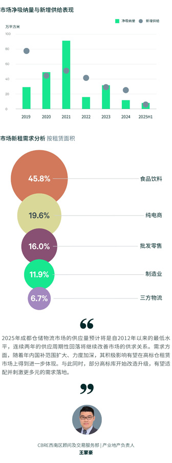 新增需求分行業(yè)看,食品飲料、電商、批發(fā)零售主導上半年去化,分別占比45.8%、19.6%、16%。分區(qū)域看,上半年新津、新都及青白江的活躍度最高,分別錄得新增需求的36.7%、18.5%及16.4%。