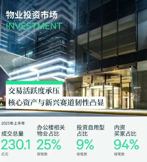 上半年投資類交易金額占比維持高位,達96%。機構(gòu)投資者最為活躍,貢獻交易總額的69%,核心辦公樓、長租公寓與消費相關(guān)物業(yè)是其重點布局方向。另外,企業(yè)買家占比14%,其中逾七成交易額為投資屬性,多偏好長租公寓、廠房等新經(jīng)濟板塊及酒店資產(chǎn)。