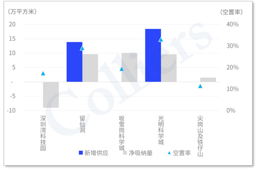其中坂雪崗科學(xué)城、留仙洞在優(yōu)質(zhì)項目不斷增加、良好的產(chǎn)業(yè)基礎(chǔ)、靈活的租賃策略及總部自用帶動下均實現(xiàn)約10萬平方米的凈吸納量。