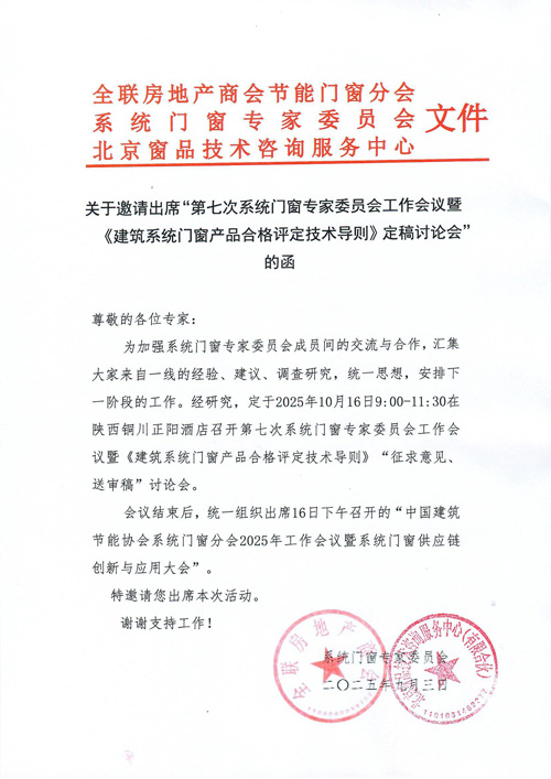 關(guān)于邀請出席“第七次系統(tǒng)門窗專家委員會工作會議暨《建筑系統(tǒng)門窗產(chǎn)品合格評定技術(shù)導(dǎo)則》定稿討論會的函