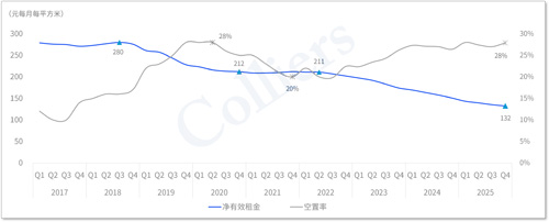 盡管新增需求逐步釋放為市場帶來曙光,但供應高峰之下租金仍處于下行通道。2025年末,深圳全市甲級寫字樓平均凈有效租金約132.2元/平方米/月,同比下降12.3%,租金同比降幅逐季收窄;優(yōu)質研發(fā)辦公凈有效租金約84.1元/平方米/月,同比下降7.4%。盡管主動下調租金的存量項目數量趨于減少,但受個別項目的經營壓力與結構性市場因素影響,整體租金水平仍延續(xù)下行趨勢。