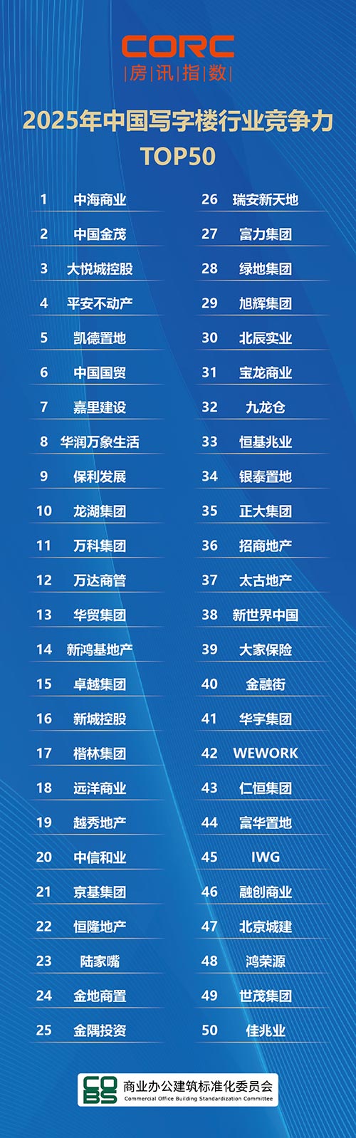 經(jīng)過房訊指數(shù)CORC評估團隊的共同努力,2025年在調(diào)研超過200個在中國境內(nèi)經(jīng)營的寫字樓、產(chǎn)業(yè)園開發(fā)商、運營商和服務(wù)商之后,最終選擇符合評估條件的100個企業(yè)品牌納入到調(diào)查與評估的目標樣本中,涵蓋行業(yè)最具代表性的商業(yè)地產(chǎn)開發(fā)、投資、運營、管理、服務(wù)集團,從而客觀并全面地反映中國境內(nèi)寫字樓、產(chǎn)業(yè)園競爭力表現(xiàn)。