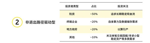 退出驅(qū)動(dòng)型:以專業(yè)資產(chǎn)管理機(jī)構(gòu)為主,通過主動(dòng)管理提升資產(chǎn)價(jià)值,最終借助REITs、并購等方式實(shí)現(xiàn)退出,偏好易標(biāo)準(zhǔn)化、可證券化的資產(chǎn)。