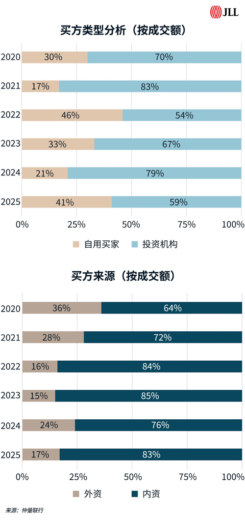 2025年北京大宗交易市場共錄得21筆成交,以小額成交為主。從買方類型來看,自用型買家較2024年增長明顯,按成交金額占比達到41%,投資型買家占比為59%。從買方來源來看,內(nèi)資買家占據(jù)主導(dǎo)地位,按成交金額占比達到83%;外資買家活躍度有所下降,占比為17%。