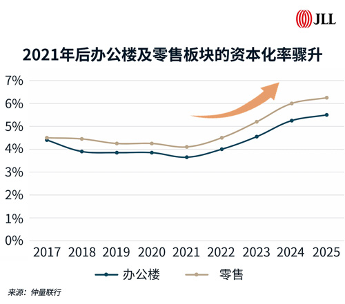 近年來,北京辦公樓和零售資產(chǎn)的資本化率顯著上升。截止2025年底,北京辦公樓和零售資產(chǎn)的資本化率分別為5.5%和6.3%,在未來兩到三年內(nèi),其資本化率仍有進一步上升的空間。