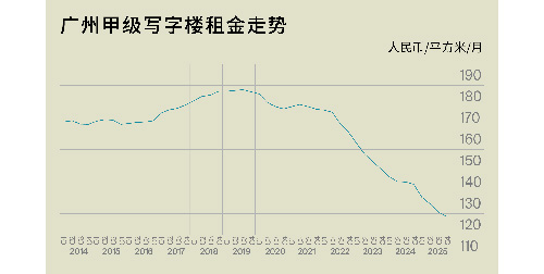 2025年第四季度,廣州全市寫字樓市場(chǎng)租金延續(xù)下行趨勢(shì),環(huán)比下滑1.7%至118.7元/平方米/月,但降幅已收窄至全年最低,價(jià)格調(diào)整從“急跌”轉(zhuǎn)向“緩釋”;仡櫲辏准(jí)寫字樓平均租金的下行節(jié)奏呈現(xiàn)階段性放緩,不過(guò)波動(dòng)幅度仍處于近十年高位。