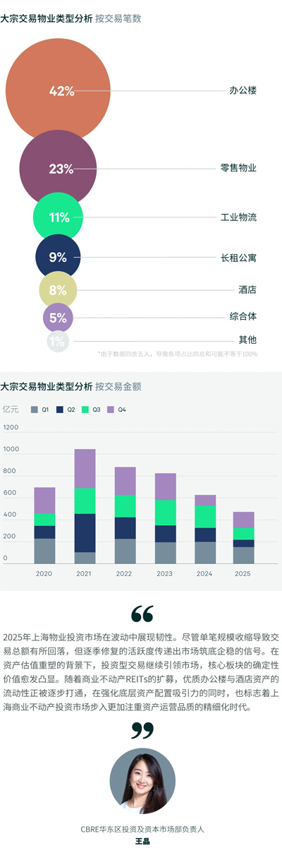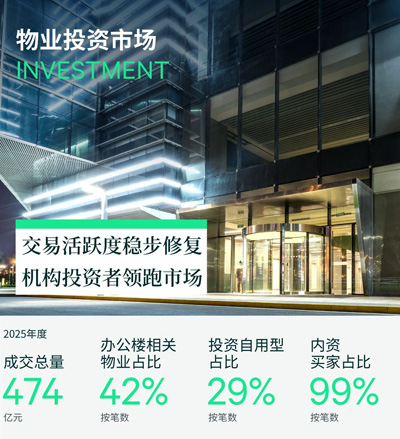 2025年,上海物業(yè)投資市場共錄得97筆交易,同比下降19%,交易總額共計474億元,同比下降26%。全年單季交易活躍度呈現(xiàn)穩(wěn)步修復態(tài)勢,投資型交易占比逾七成。單筆交易規(guī)模趨向小型化,十億元以下交易占比高達87%。