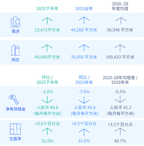 2025年下半年,市場租金仍處于下行通道,但租金的降幅已有所收窄,環(huán)比下降2.8%,同比下降7.6%至49.8元每月每平方米。