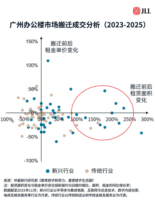 在租金回調(diào)窗口期,新興行業(yè)正以更具競(jìng)爭(zhēng)力的成本,入駐服務(wù)更優(yōu)、產(chǎn)品標(biāo)準(zhǔn)更高的甲級(jí)項(xiàng)目。過去三年中,70%面積大增的搬遷案例來(lái)自新興行業(yè),且其對(duì)高品質(zhì)的辦公載體具備明確而切實(shí)可行的升級(jí)訴求。