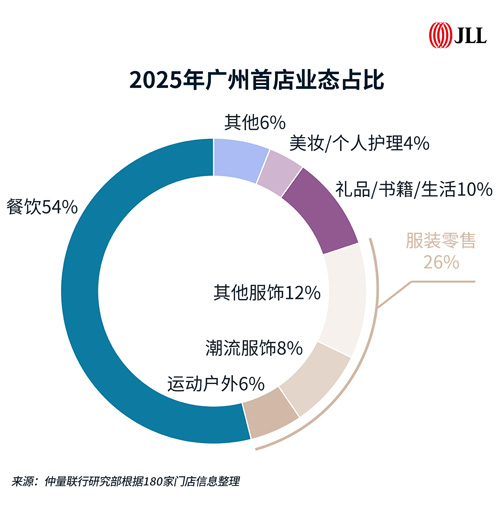 為順應(yīng)消費(fèi)者行為的演變,廣州零售市場(chǎng)持續(xù)推動(dòng)商業(yè)創(chuàng)新與品牌迭代。值得注意的是,餐飲業(yè)態(tài)為全年新開首店“主力”,占比超50%,且在品類和風(fēng)味上愈發(fā)多元;服裝零售業(yè)態(tài)以26%的占比位居第二。