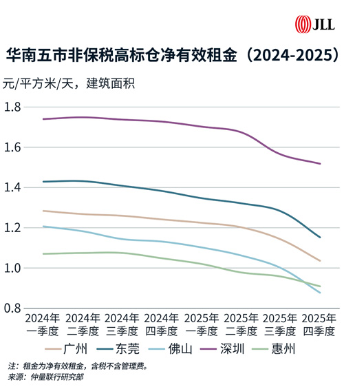 供需錯(cuò)配下,租戶決策更趨理性審慎,業(yè)主普遍通過下調(diào)報(bào)價(jià)、延長(zhǎng)免租期等方式促進(jìn)去化,優(yōu)質(zhì)租戶則借市場(chǎng)窗口期優(yōu)化租約結(jié)構(gòu)以鎖定更優(yōu)成本。受此影響,全年華南市場(chǎng)多數(shù)城市租金跌幅超10%,且下半年下行速度有所加快。