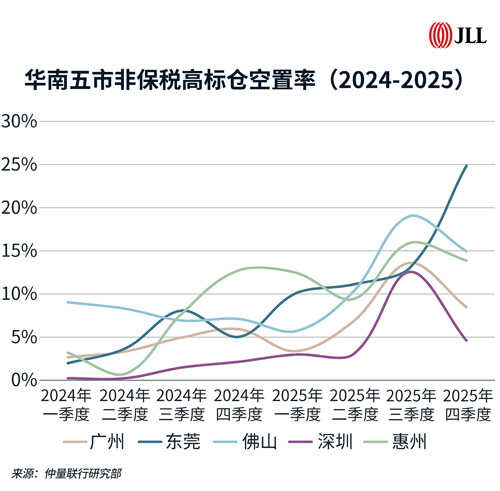 在供應(yīng)端,華南五市全年非保稅高標(biāo)倉(cāng)新增約487萬(wàn)平方米,創(chuàng)歷史新高。短期供給集中入市推動(dòng)整體空置率上行,部分供給較大的子市場(chǎng)去化滯后,空置壓力突出。