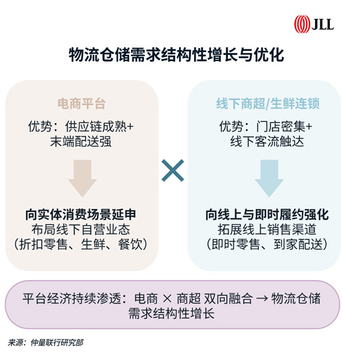 需求增長(zhǎng)點(diǎn)將聚焦商超電商新業(yè)態(tài)融合:電商平臺(tái)加速向?qū)嶓w消費(fèi)場(chǎng)景延伸,布局多元自營(yíng)業(yè)態(tài);連鎖商超則積極構(gòu)建線上渠道,發(fā)展即時(shí)配送。這一趨勢(shì)將催生更多城配倉(cāng)儲(chǔ)需求,為市場(chǎng)提供長(zhǎng)期韌性支撐。