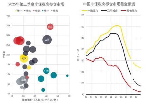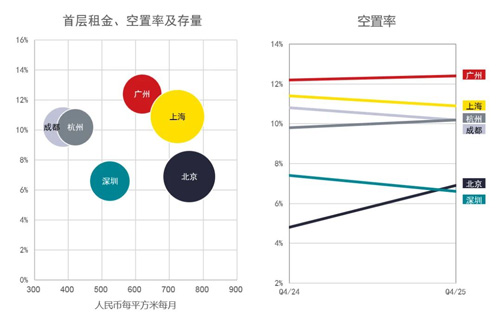 截至2025年末,六座核心城市平均租金同比下跌2.2%,空置率微升0.1個(gè)百分點(diǎn)。其中,北京由于數(shù)個(gè)大體量項(xiàng)目陷入經(jīng)營調(diào)整,導(dǎo)致空置率升幅較大;而除北京之外的五座城市空置率均呈走穩(wěn)或微降的態(tài)勢(shì)。