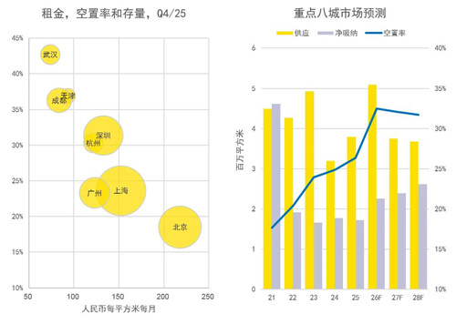展望2026年,結(jié)合市場(chǎng)對(duì)“名義利率穩(wěn)中有降”與“通脹水平溫和回升”的普遍預(yù)期,中國的實(shí)際利率水平有望迎來趨勢(shì)性下降。這一轉(zhuǎn)變預(yù)計(jì)將對(duì)整體地產(chǎn)投資市場(chǎng)形成一定支撐,但各類資產(chǎn)價(jià)值的分化也將隨之進(jìn)一步被加。夯久鎻(qiáng)勁的資產(chǎn)將率先受益于流動(dòng)性改善,而基本面薄弱的資產(chǎn)則將愈發(fā)深陷估值困境。