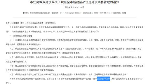 據(jù)蘇州住建局網(wǎng)站消息,蘇州住建局10月9日發(fā)布《關(guān)于規(guī)范全市新建成品住房建設(shè)銷售管理的通知》(以下簡(jiǎn)稱《通知》)!锻ㄖ访鞔_,成品住房裝修綜合單價(jià)不宜低于土地出讓樓面單價(jià)5%~10%且不低于1000元/平方米。