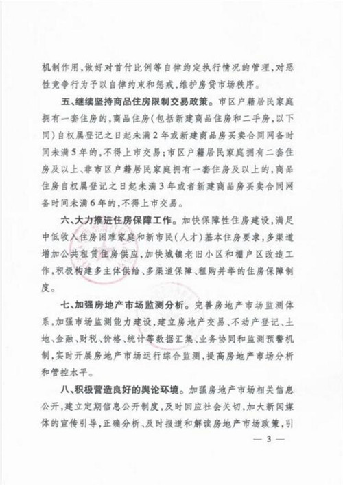 市區(qū)戶(hù)籍居民家庭擁有二套住房及以上、非市區(qū)戶(hù)籍居民家庭擁有一套住房及以上的,權(quán)屬登記未滿3年或新建商品房買(mǎi)賣(mài)合同網(wǎng)備時(shí)間未滿6年的,不得上市交易。