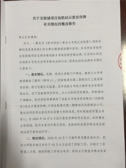 10月7日下午,濟南市章丘區(qū)住建局發(fā)現(xiàn)網(wǎng)絡相關信息后,第一時間責令寶能城項目進行整改;